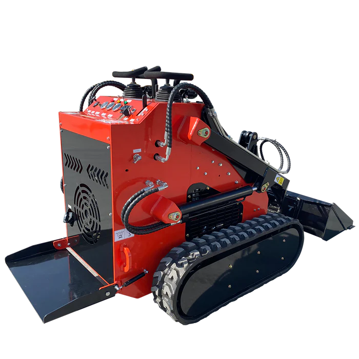 The is a track style mini skid steer loader designed for compact construction work. It has a quick attach mount plate which makes it easy for an operator to connect different attachments. The loader is designed for operation in temperatures typically experienced in earth moving and construction work environments.