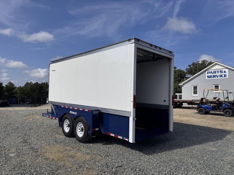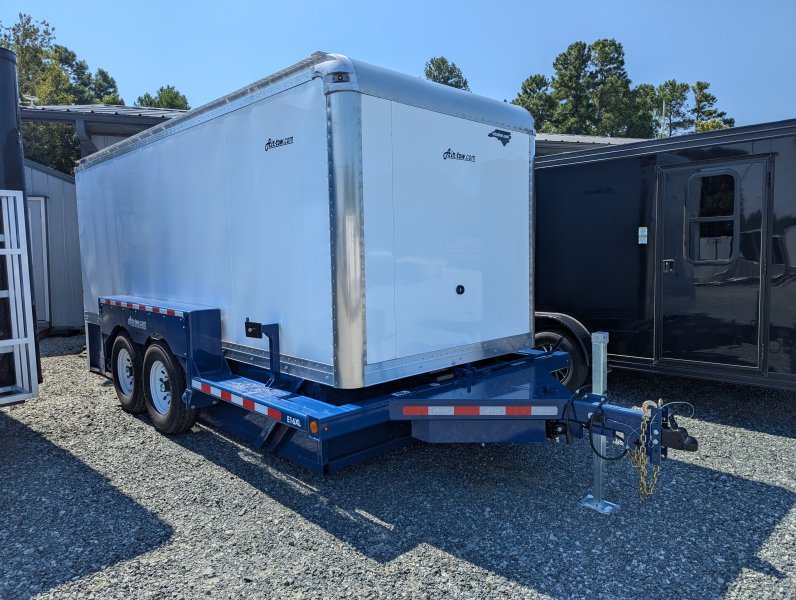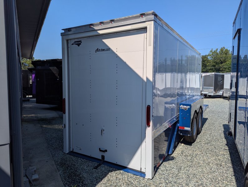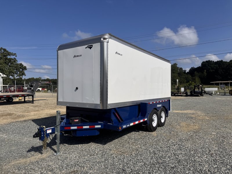 This E16 XL with 75″ inside width x 15’10” long inside box drop deck enclosed trailer from Air Tow has tandem axles with a rubber suspension, electric brakes, and spare tire and spare tire mount. These units come standard with: