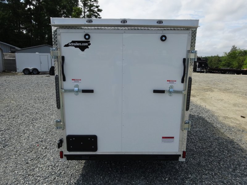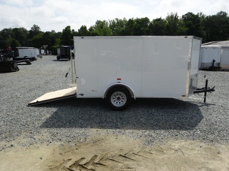 “This v-nose 5×10 enclosed cargo trailer has a single non-braking idler axle with a rating of 2,990 lb GVWR. This type of trailer is ideal for light-duty or residential tasks. This model has no side door, a rear ramp door, and a 2000 lb jack.