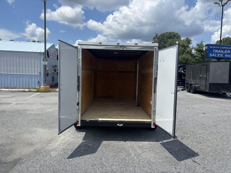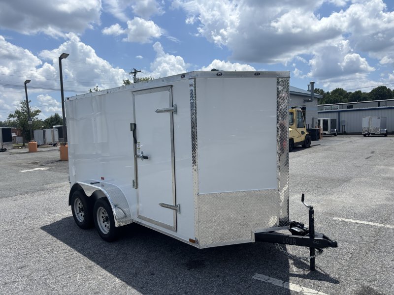 “This v-nose 6×12 enclosed cargo trailer has 6’3″” interior height, a tandem braking axle with a rating of 7,000 lb GVWR. This type of trailer is ideal for light-duty or residential tasks. This model has a side door, a rear barn door, and a 2000 lb jack.