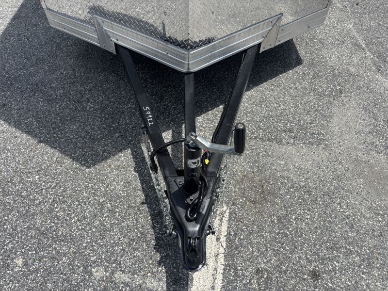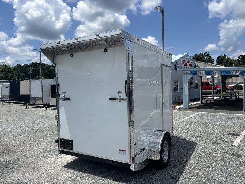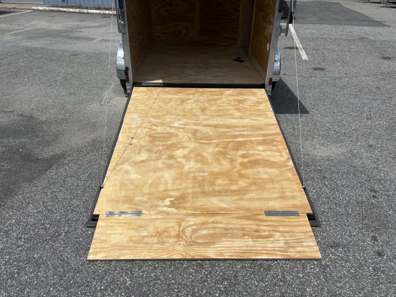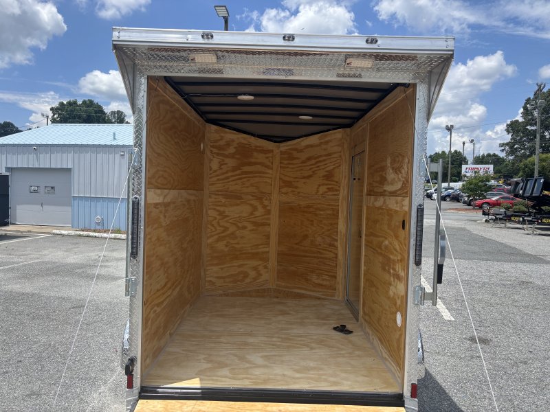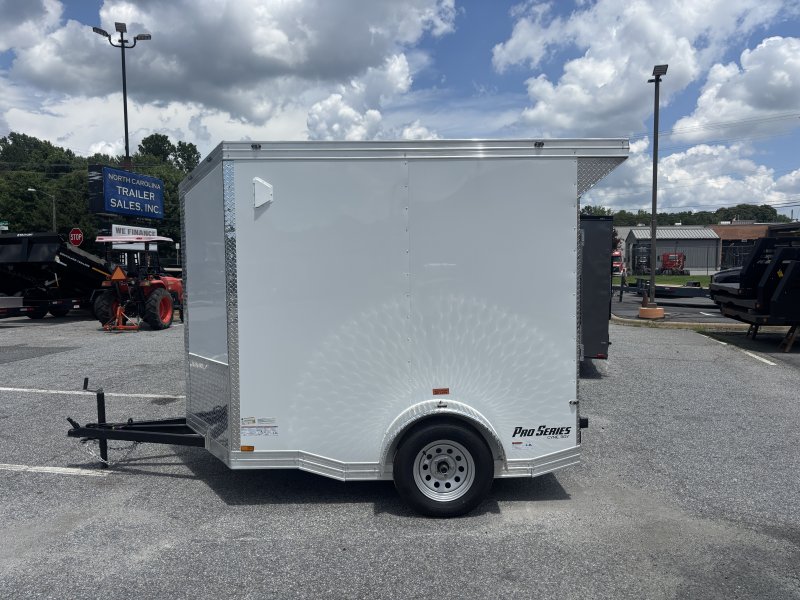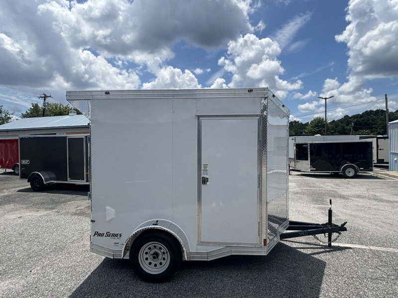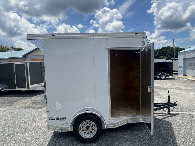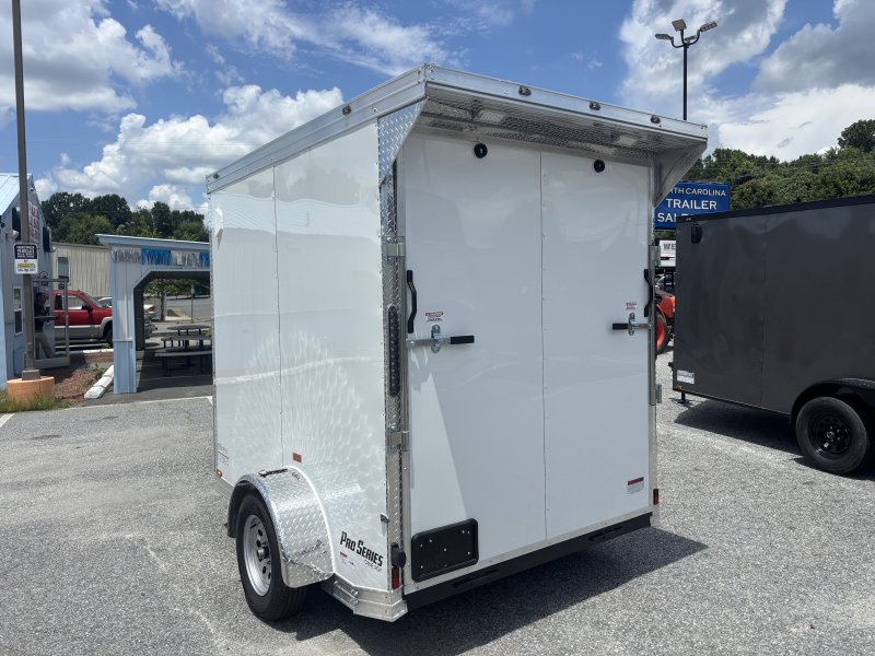 “This Pro Series v-nose 6×8 enclosed cargo trailer has a single non-braking idler axle with a rating of 2,990 lb GVWR. This unit has 16″” OC roof members, 0.080″” polycore skin, one-piece aluminum roof. This type of trailer is ideal for light-duty or residential tasks. This model has a side door, a rear ramp door, and a 2000 lb jack.
