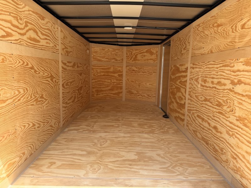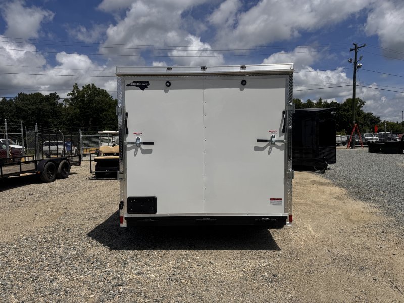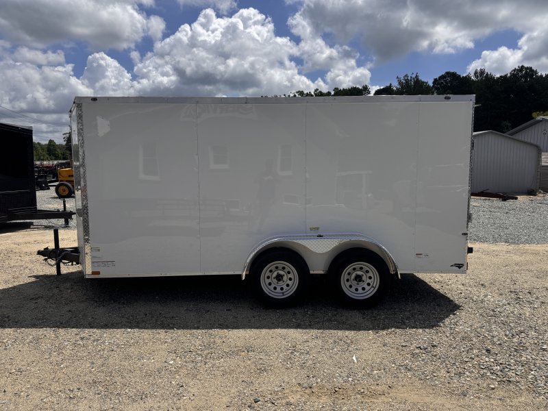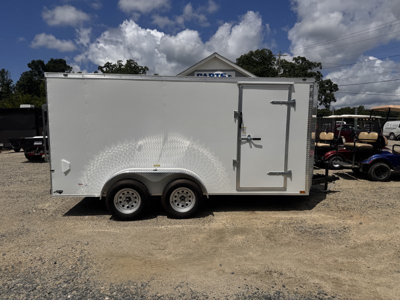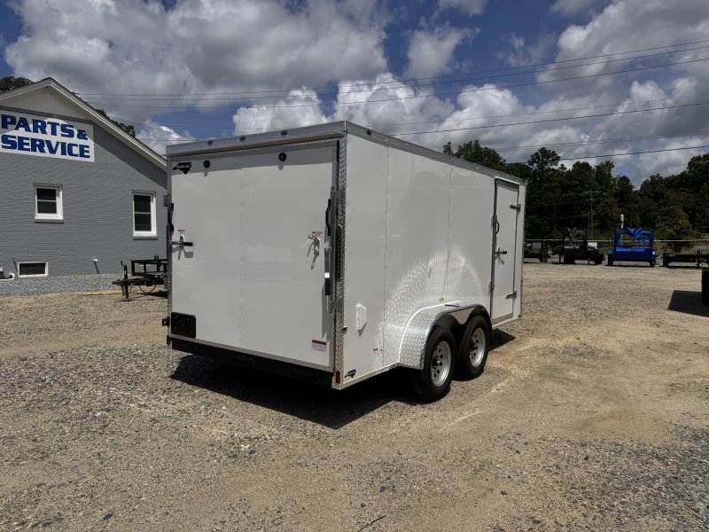 “This v-nose 7×14 enclosed cargo trailer has a 6’3″” interior height, tandem axles with brakes with a rating of 7,000 lb GVWR. It has a .080 metal Exterior. This model has a side door, a rear ramp door, and a 2000 lb jack.