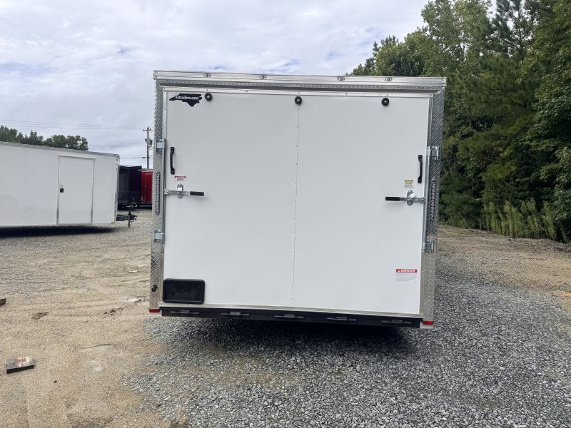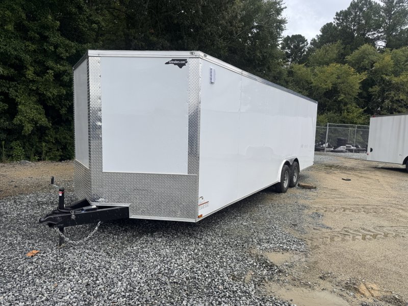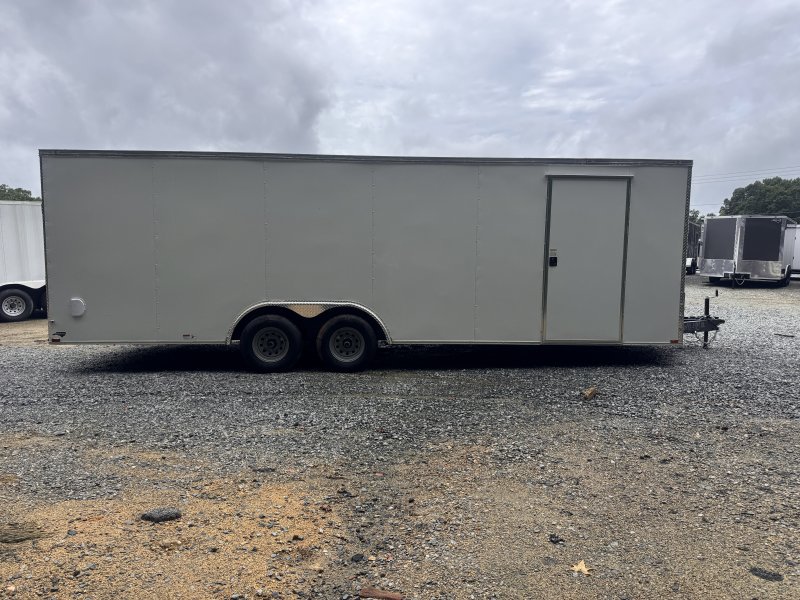 “This v-nose 8.5×24 enclosed cargo trailer has a 6’6″” interior height, tandem axles with brakes with a rating of 10,000 lb GVWR. This type of trailer is ideal for light-duty or residential tasks. This model has a side door, a rear ramp door, and a 2000 lb jack.