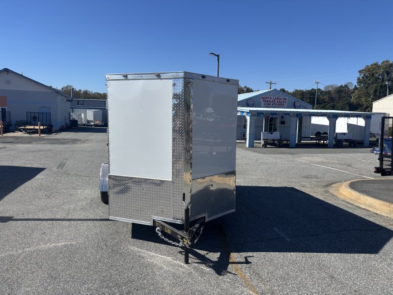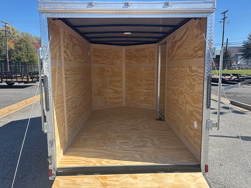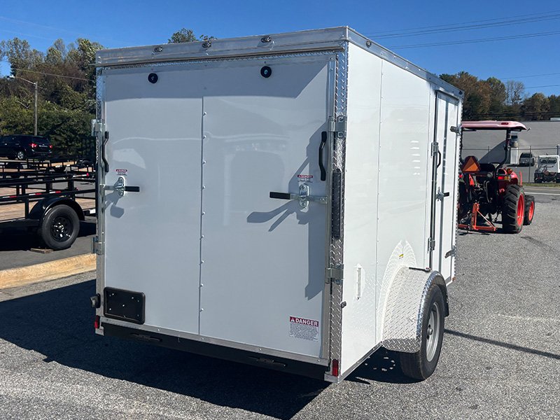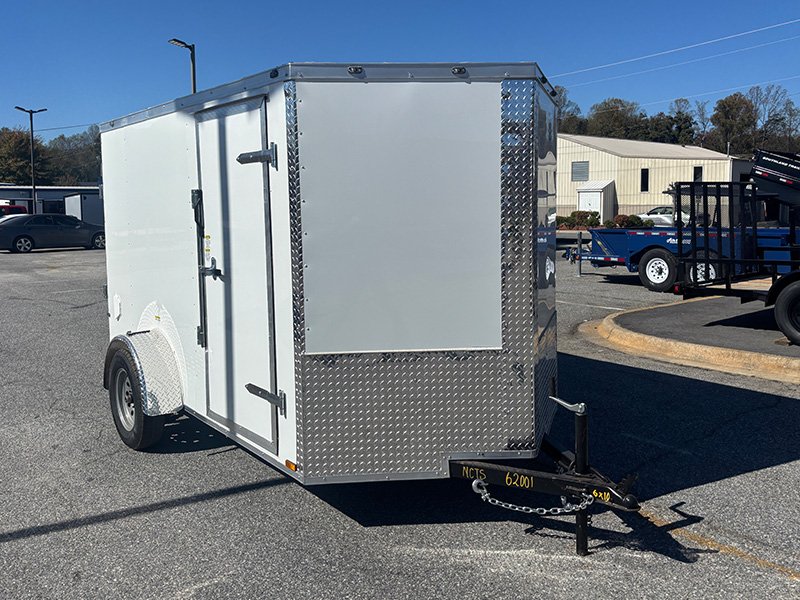 “This v-nose 6×10 enclosed cargo trailer has a single non-braking idler axle with a rating of 2,990 lb GVWR. This type of trailer is ideal for light-duty or residential tasks. This model has a side door, a rear ramp door, and a 2000 lb jack.