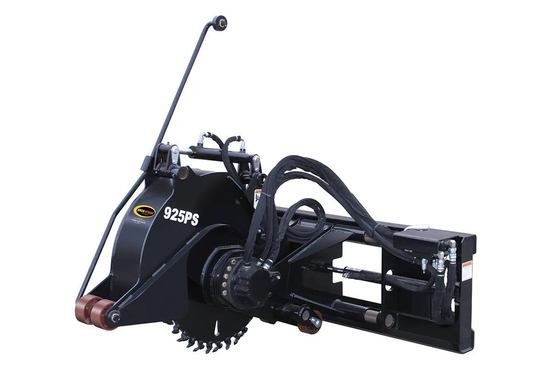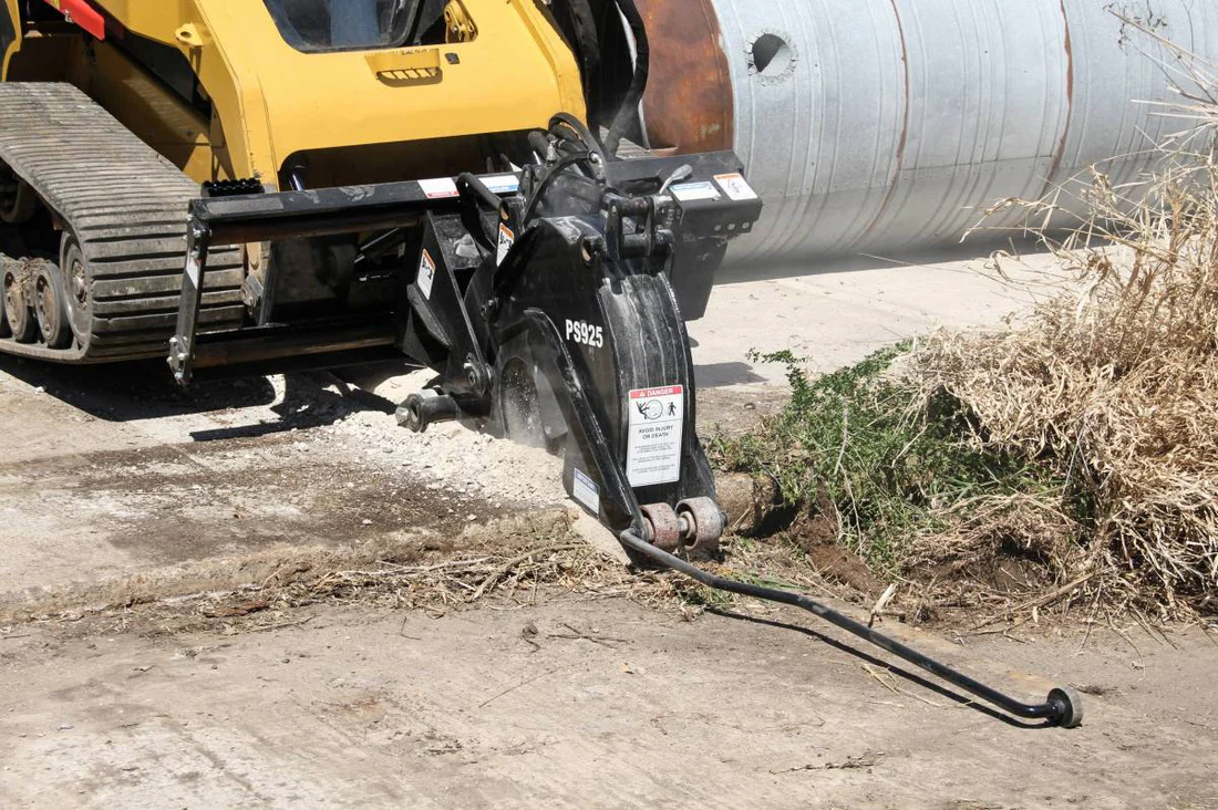 The Pavement Saw is a cost effective alternative to a more cumbersome self-propelled saw unit. With its powerful planetary/motor combination, the 9” cutter wheel depth is ideal for cutting patches, expansion joints and pavement cuts for utility and traffic loops. Planetary drive motor and tungsten carbide teeth eat through asphalt and hard surfaces with ease. The patented electro-hydraulic side-shift enables the Razor Tooth to cut close to walls, curbs and other fixed objects.