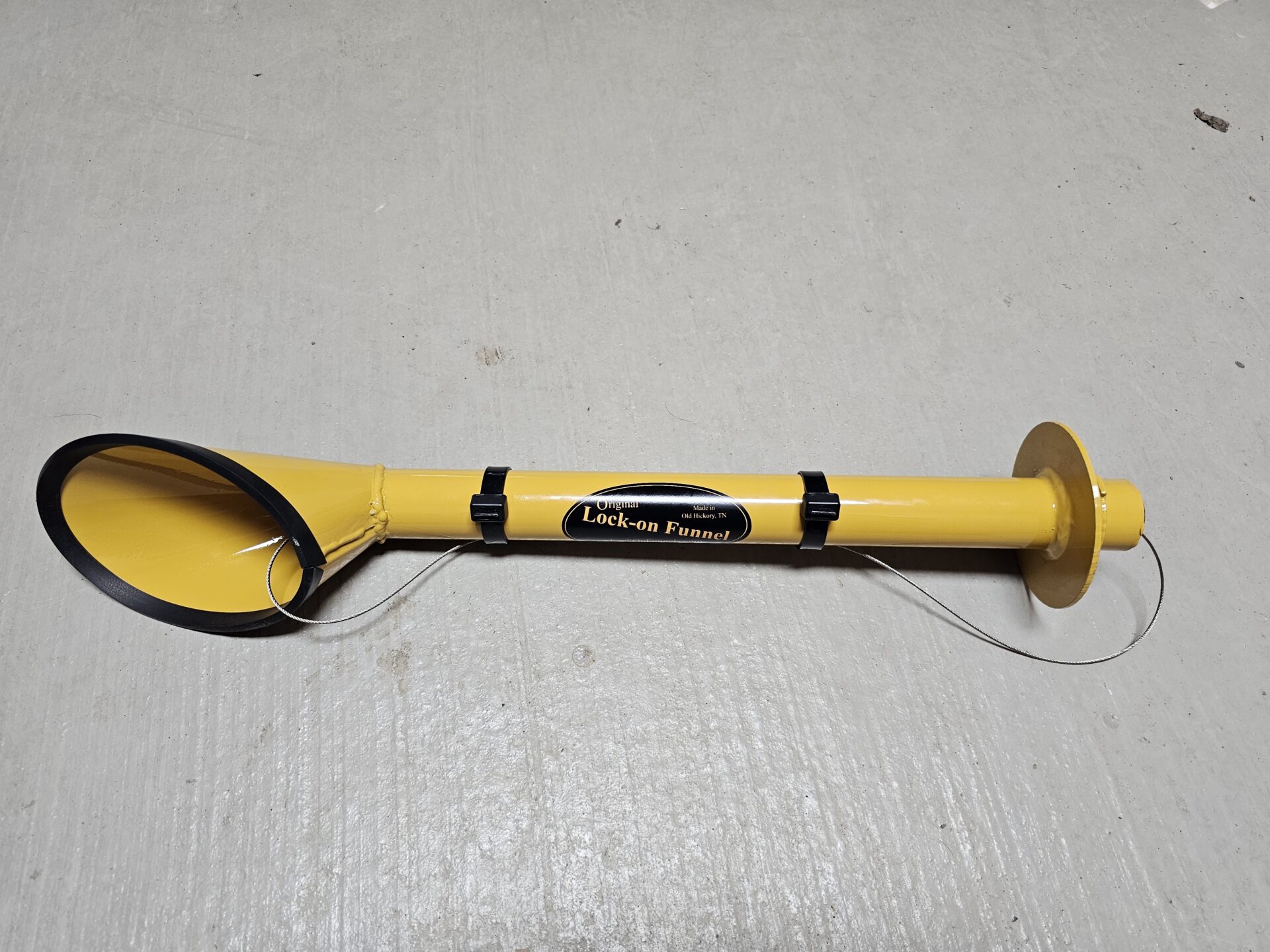 The funnel was invented because of frustration of putting hydraulic oil in a Caterpillar® compact track skid loader. The reservoir is tucked away inside the machine in between the tracks and the loader boom arm making it extremely hard to hold a 5-gallon can of fluid and refill the reservoir. This is not an ordinary funnel it is very heavy duty with all welded steel construction and proudly made in Old Hickory Tennessee.