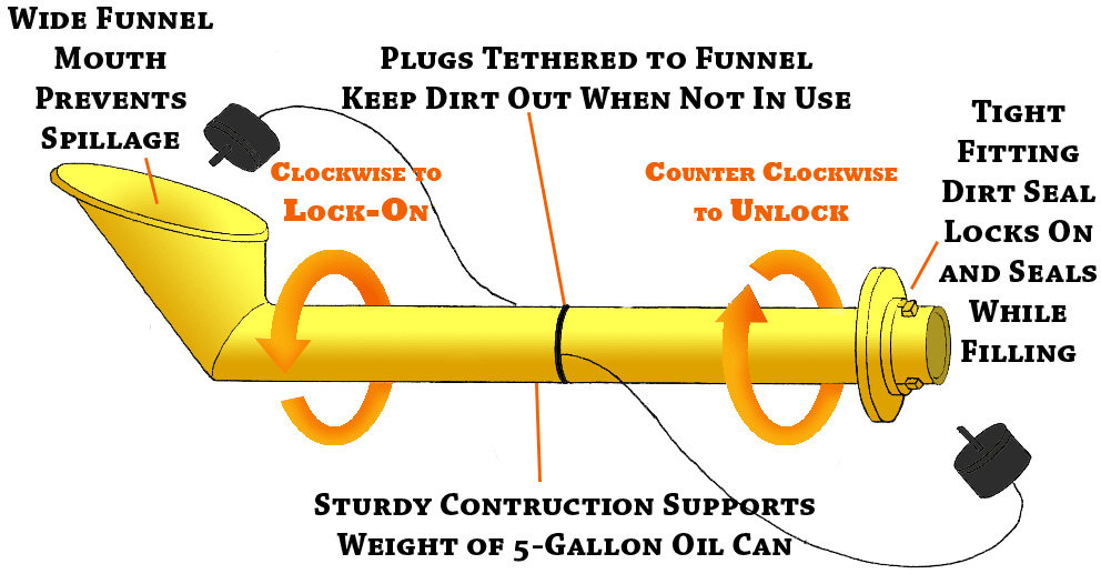 Large flange at the base of the funnel keeps debris out of the hydraulic reservoir tank