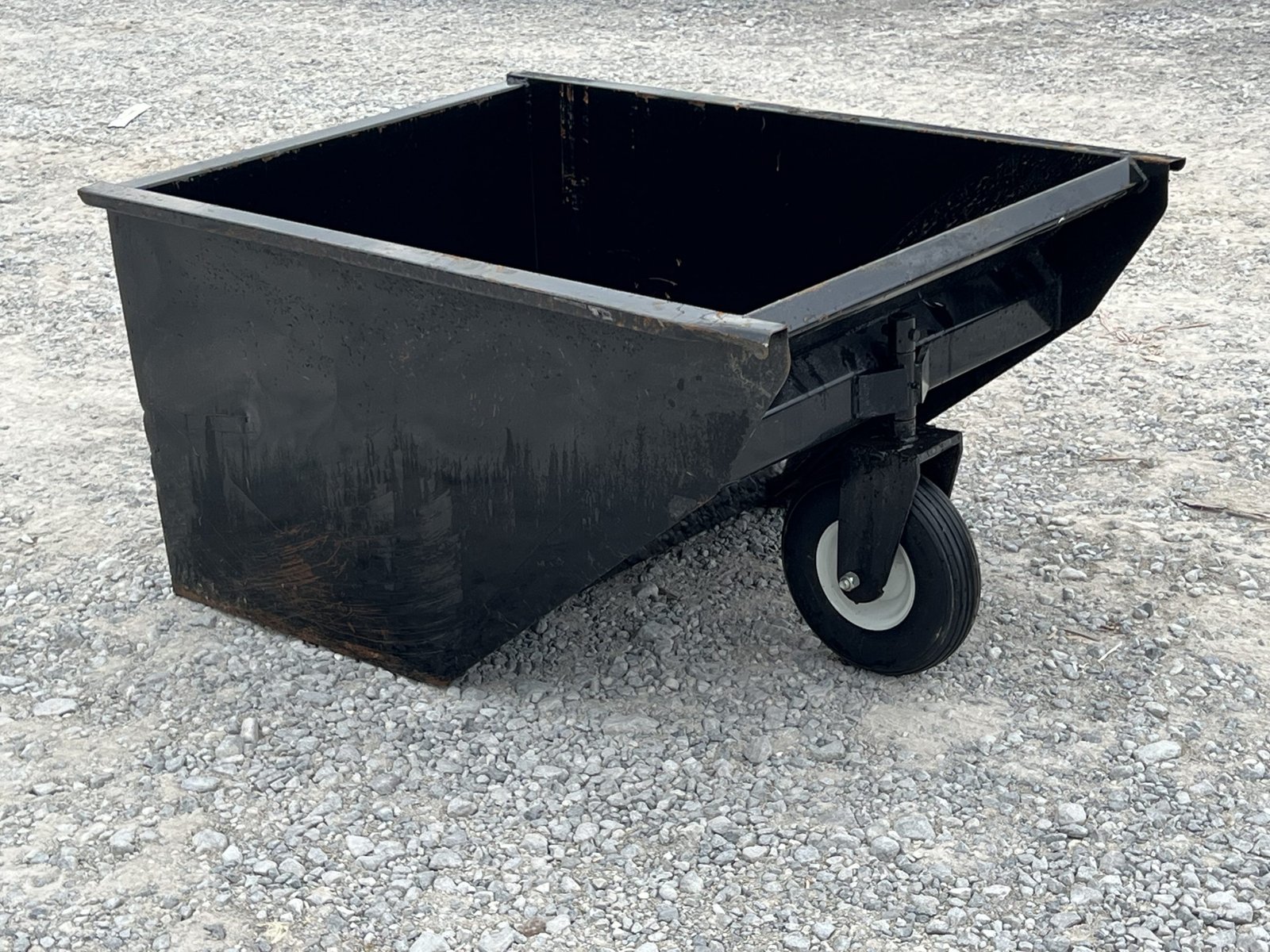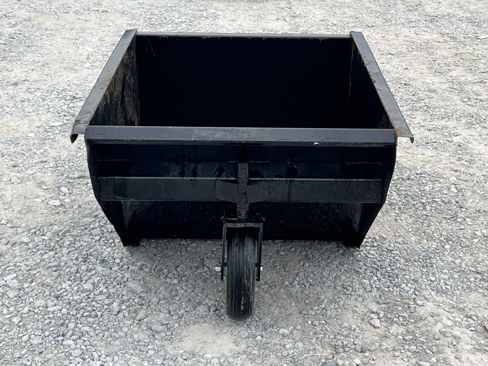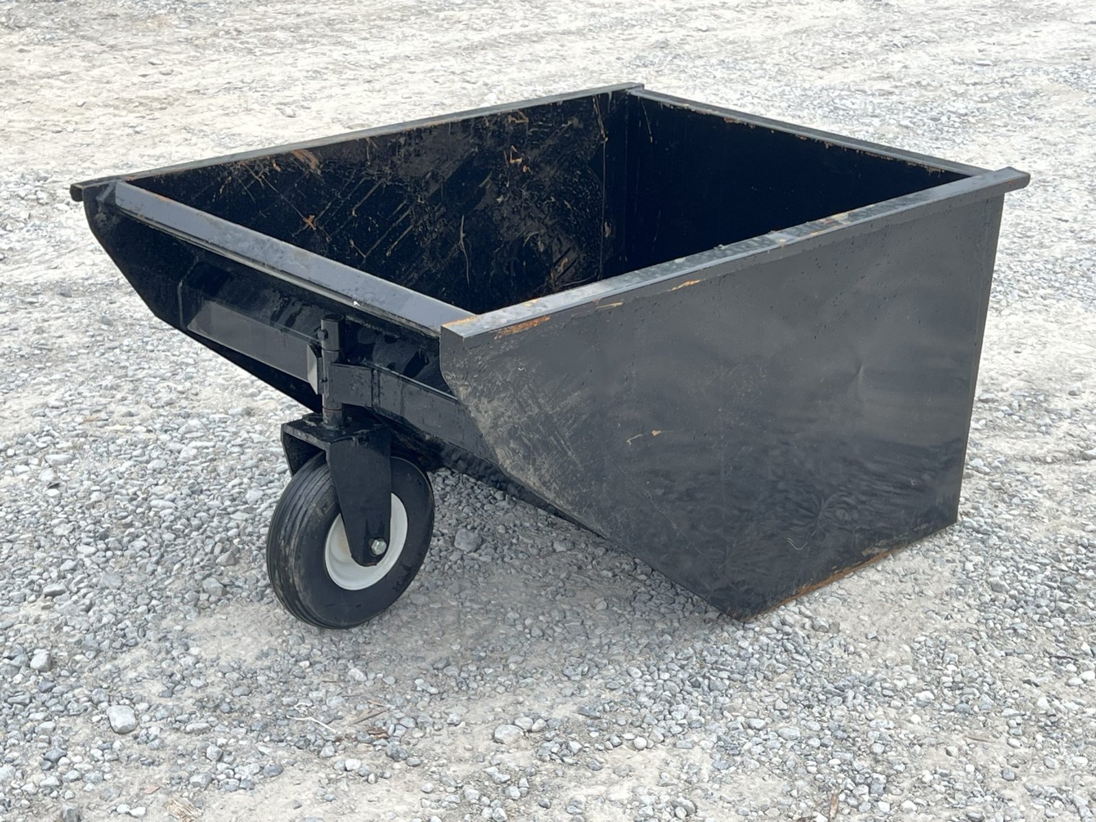 This is an unused wheel barrow dumping hopper attachment for a mini skid steer with the mini universal mounting system. This attachment has a wheel on the front and will allow your mini skid steer to transport heavier loads without the machine tipping forward. This is great for landscaping to transport materials into the back of yards.