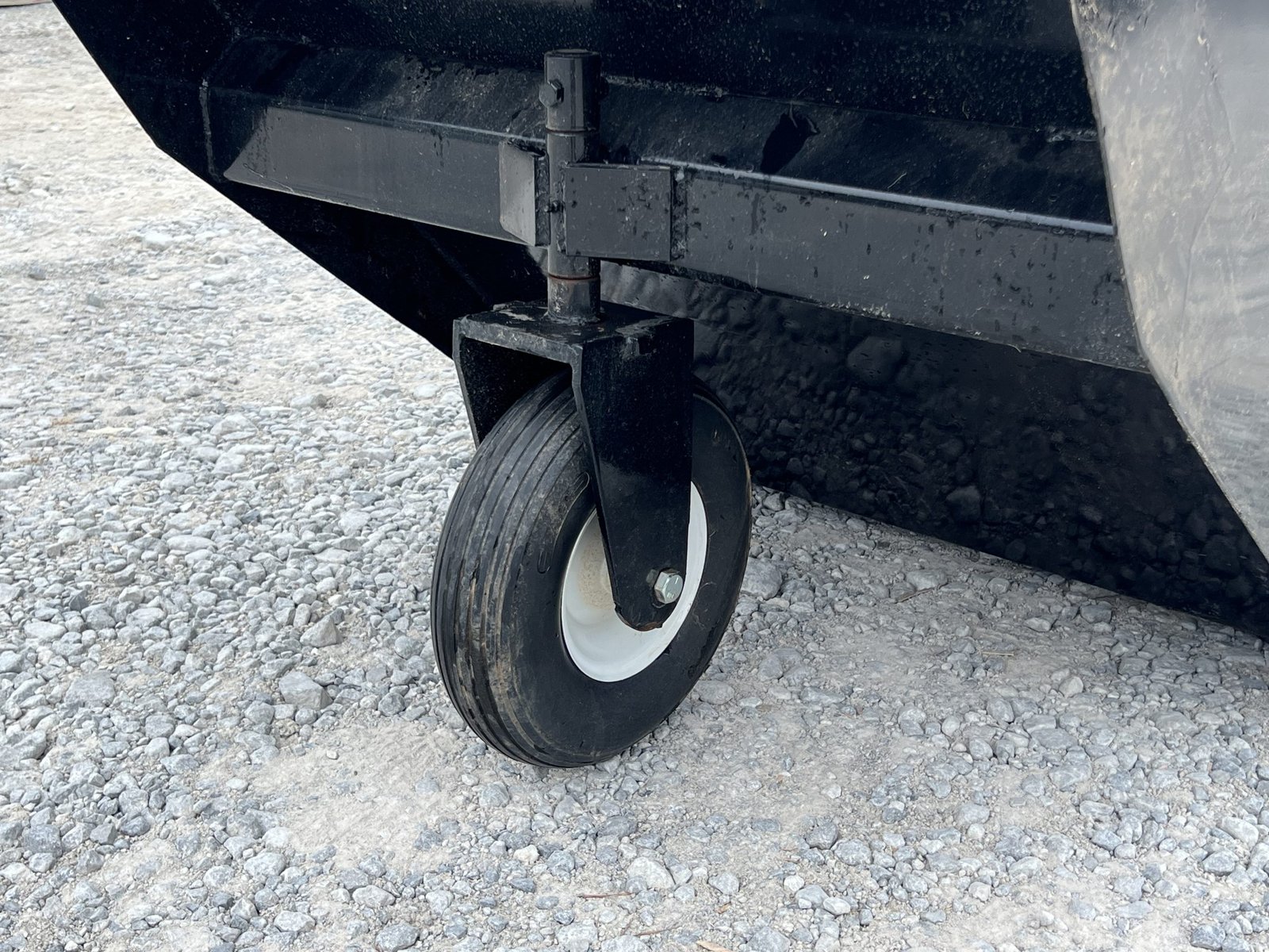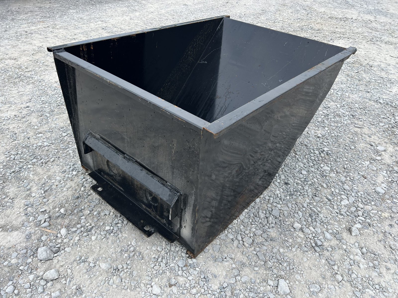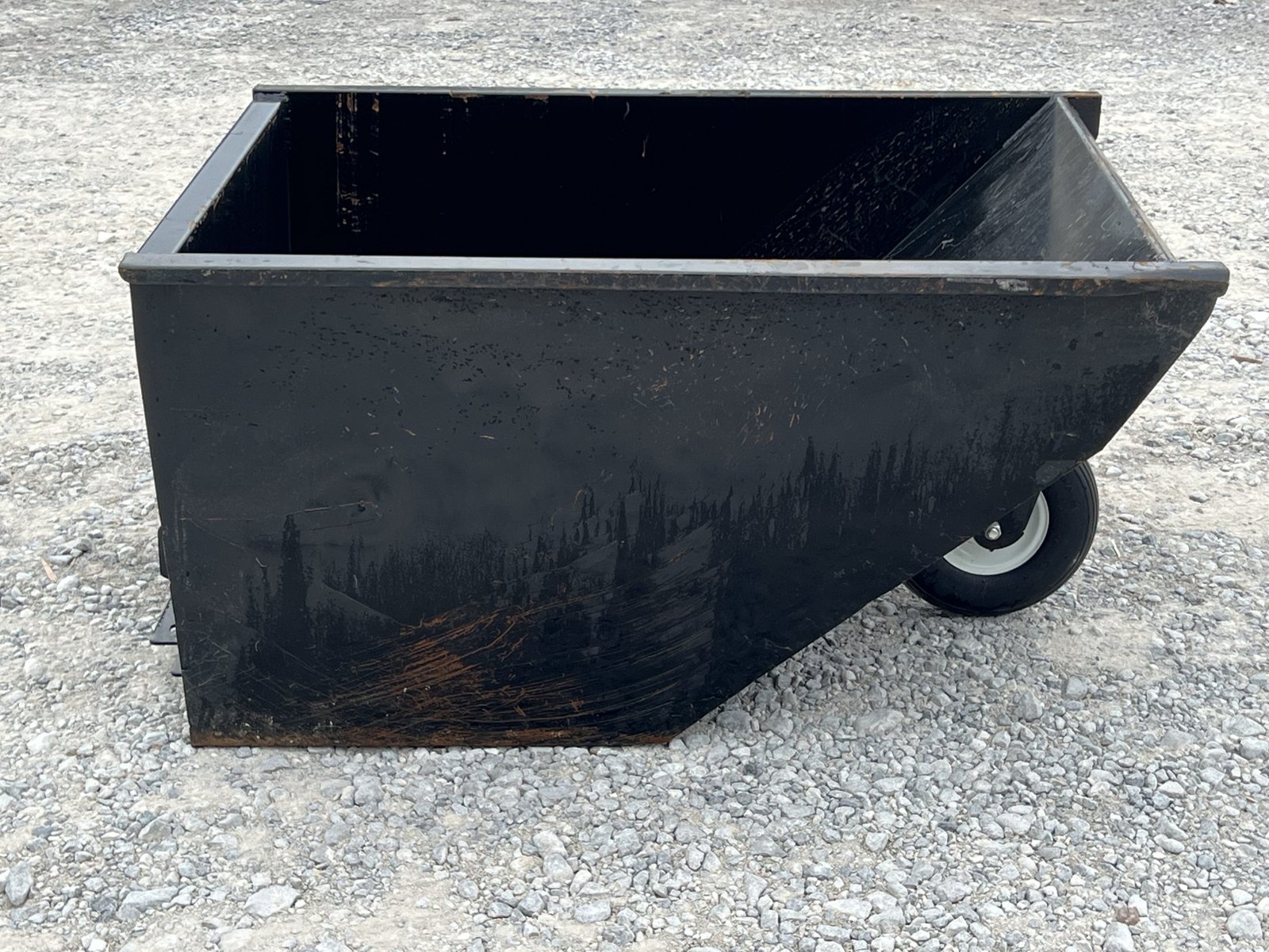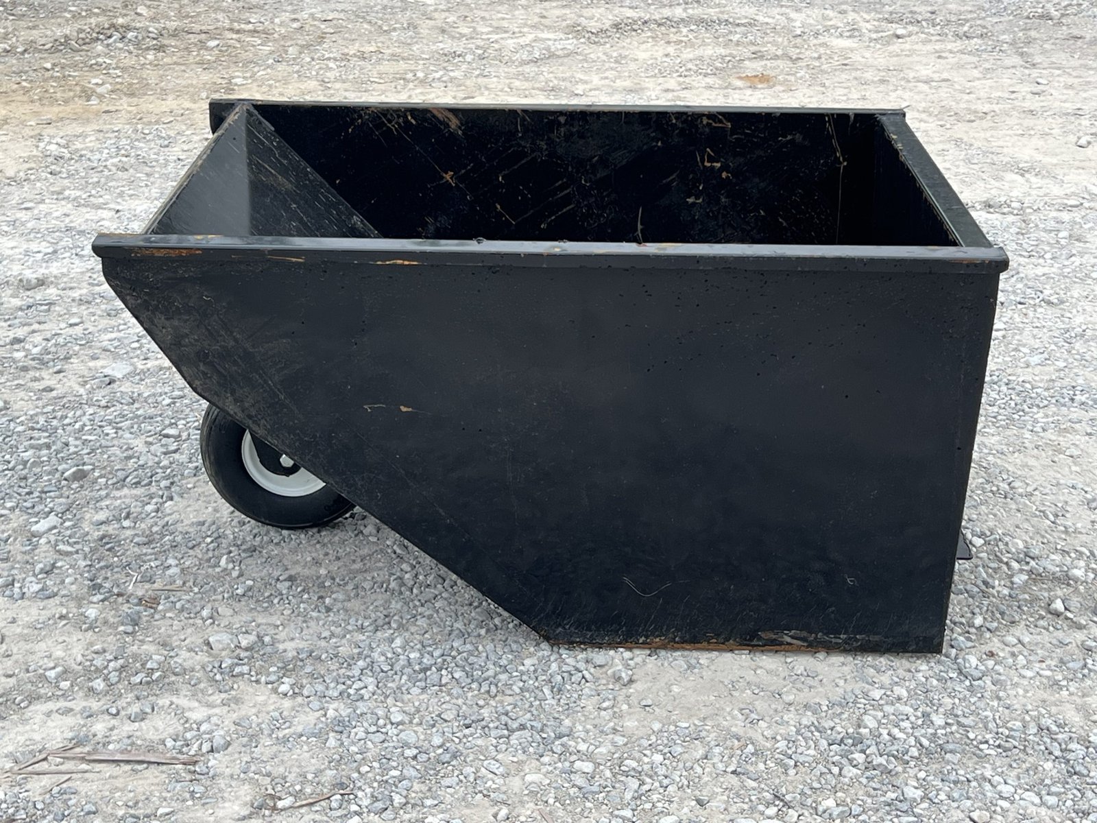 This is an unused wheel barrow dumping hopper attachment for a mini skid steer with the mini universal mounting system. This attachment has a wheel on the front and will allow your mini skid steer to transport heavier loads without the machine tipping forward. This is great for landscaping to transport materials into the back of yards.